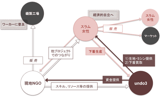 バングラデシュで「女性と子供の支援」を行っている、現地NGOとの協力モデル。undo3は、現地NGOを通じて、彼らが管轄するスラムの女性にミシン・生地の提供を行う。スラム女性は、スラム内で下着を生産し、自ら域内や近隣マーケット等で販売。スラム・マーケット内のマーケティングはすべてスラム女性自身に委任する。